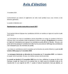 Avis d’élection pour représentant en Santé Sécurité au Travail (SST)